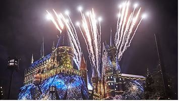 Em Hogsmeade tem apresentação natalina do grupo Frog Choir e ao anoitecer uma encantadora projeção iluminada no Castelo de Hogwords.